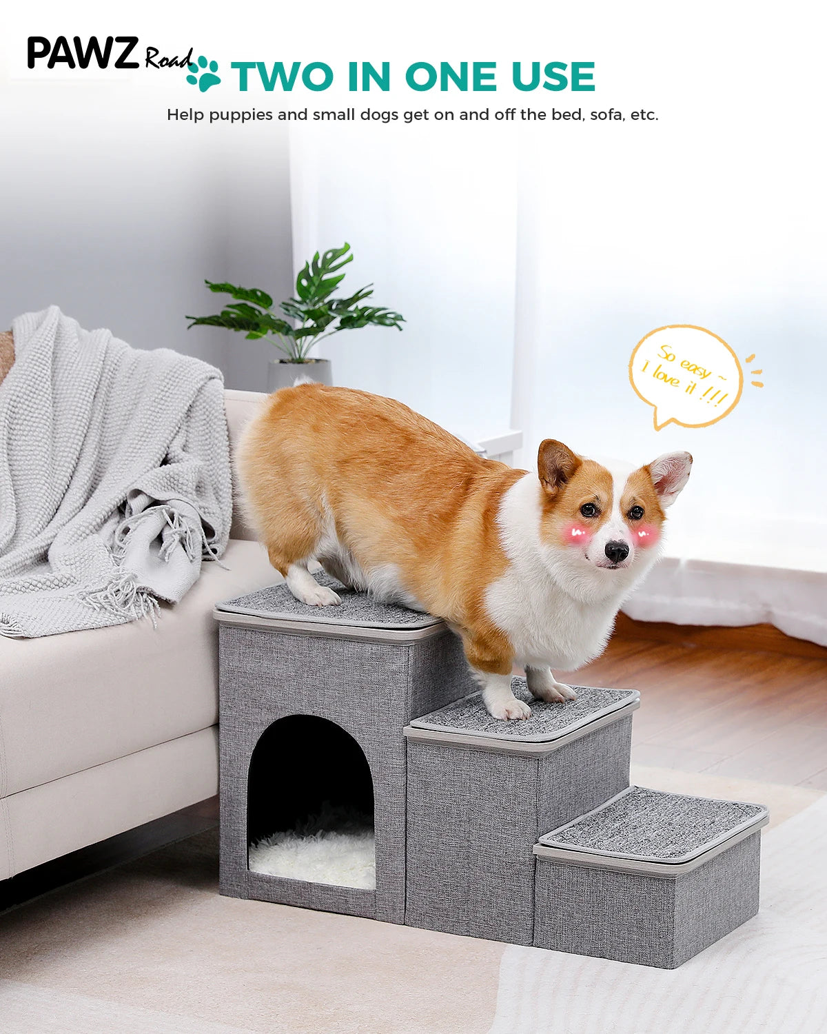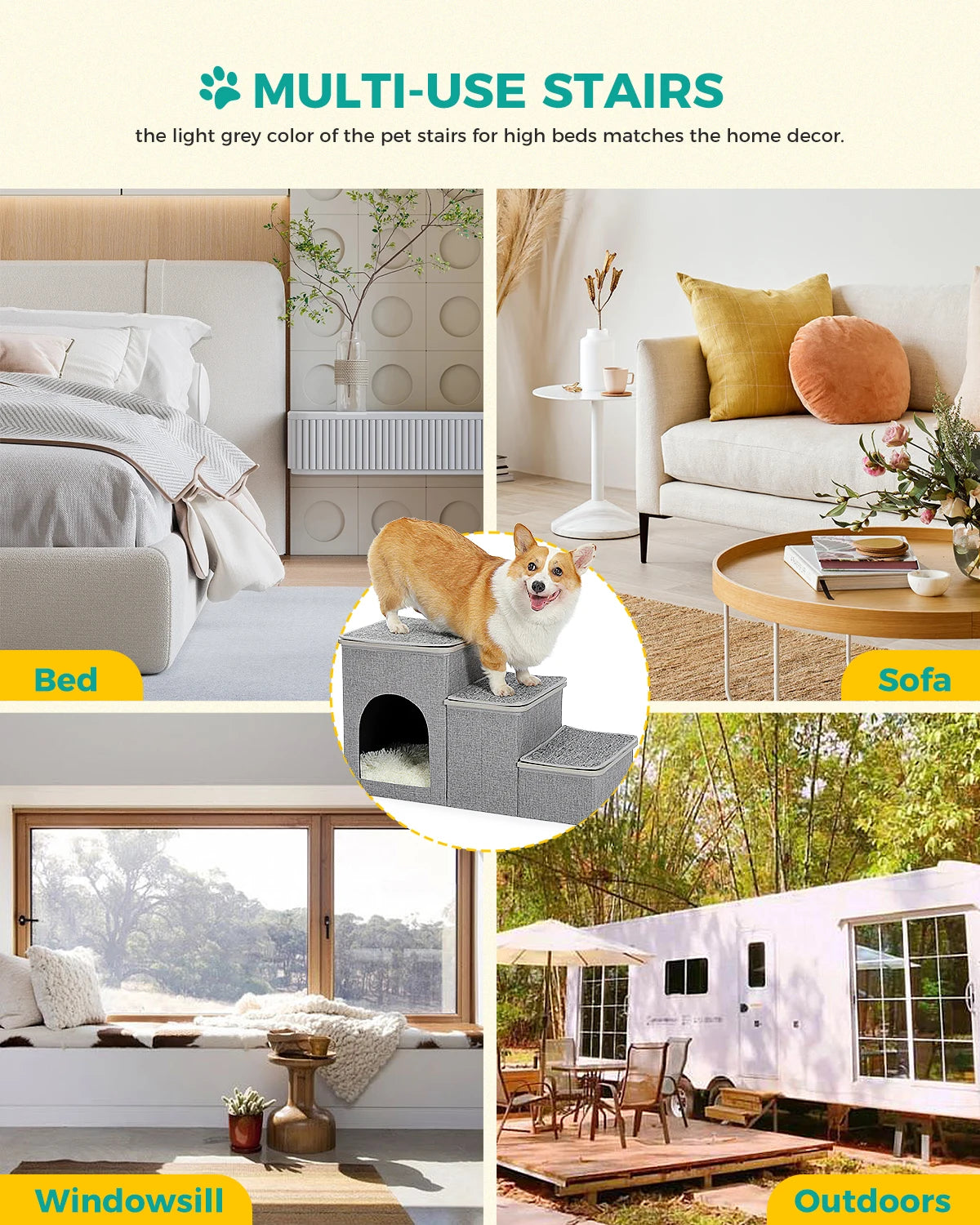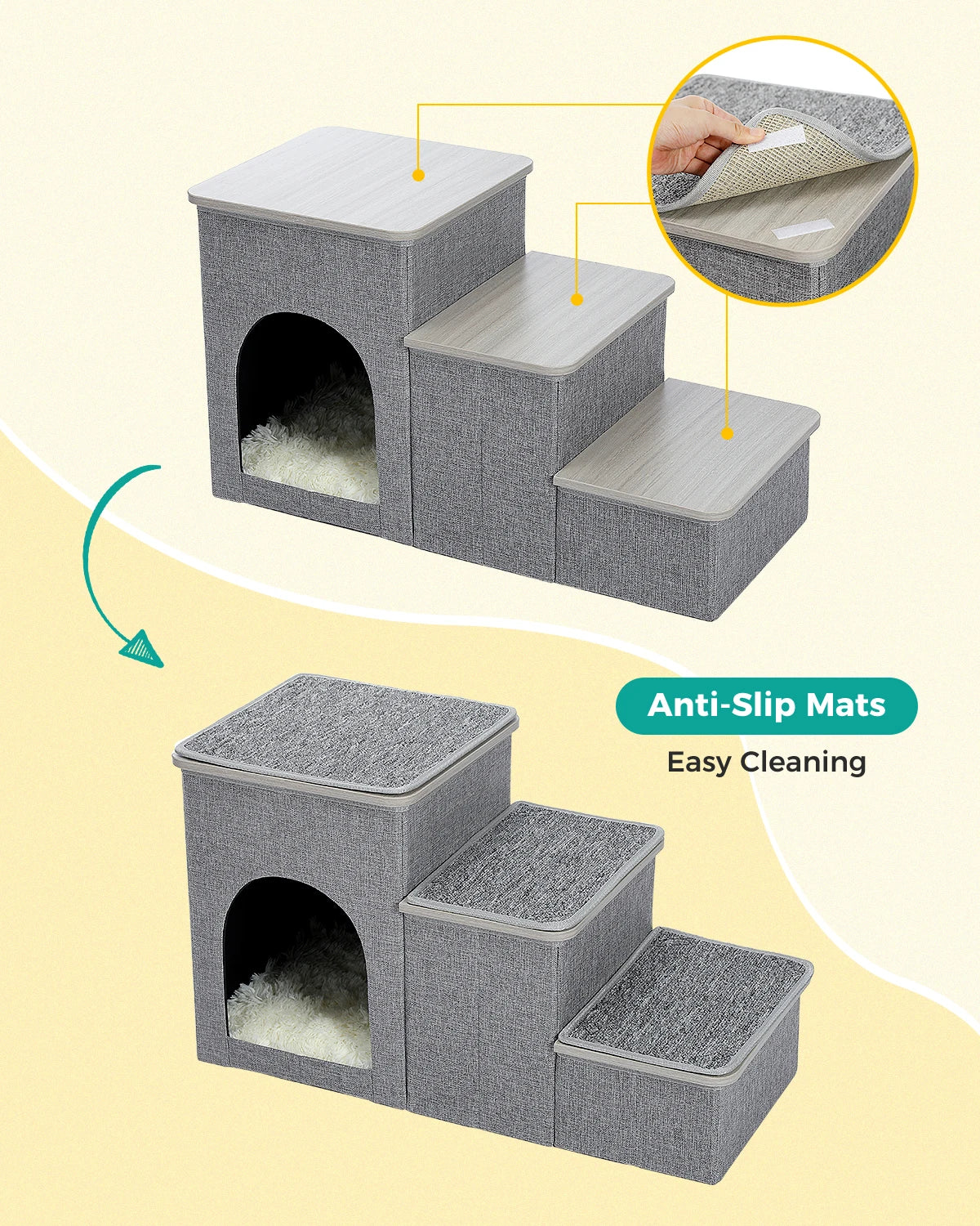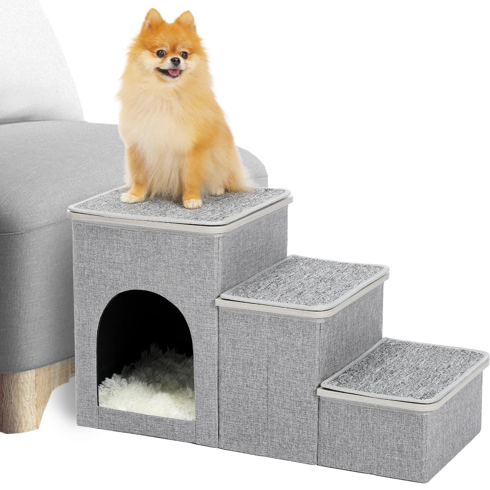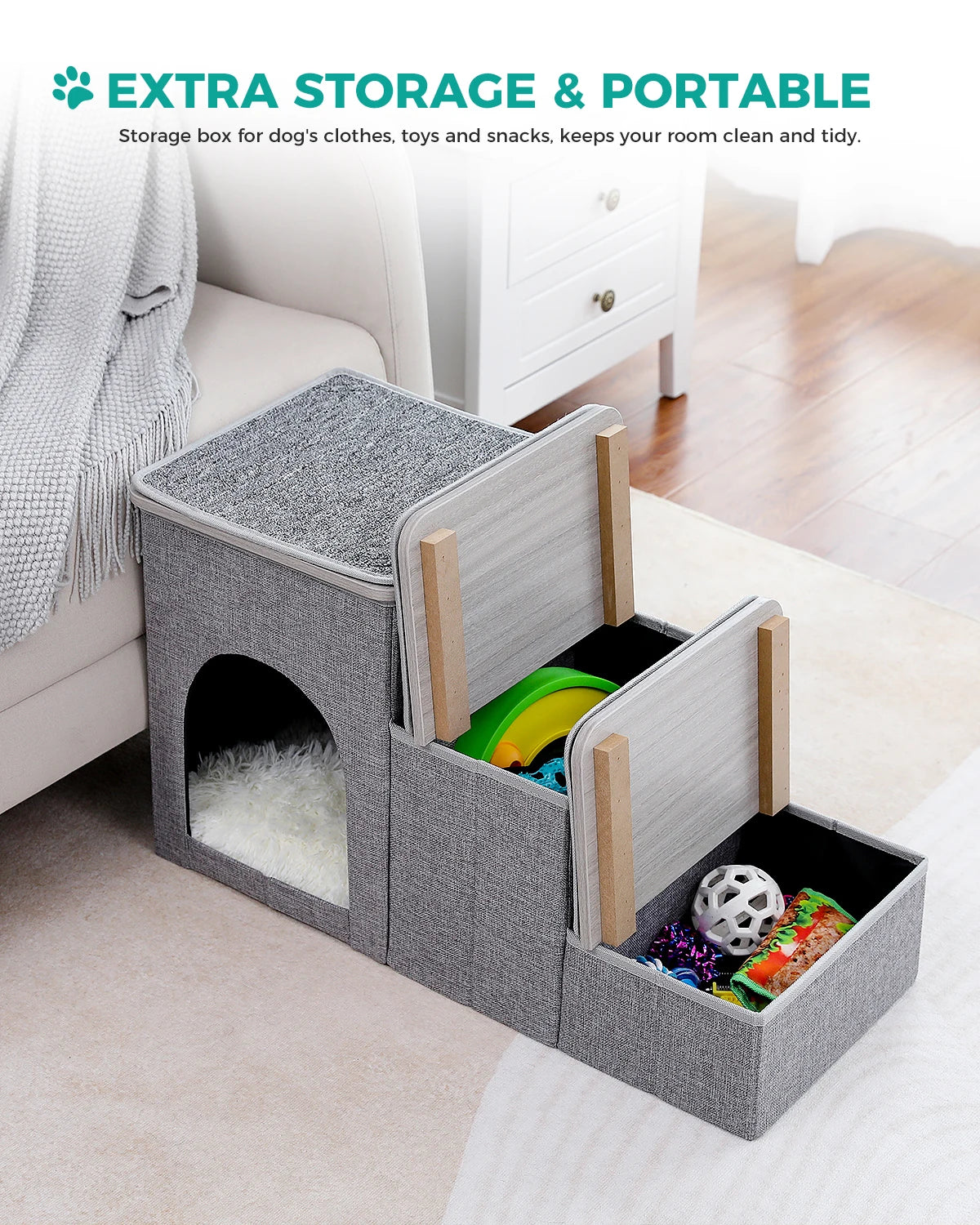 Design dois em um: esta escada para animais de estimação não só serve como uma escada para animais de estimação, como também oferece ao seu amiguinho peludo um aconchegante refúgio para animais de estimação. As escadas são cobertas com tampas removíveis e os primeiros 2 degraus são projetados como caixas de armazenamento, onde os donos podem guardar brinquedos, ração ou quaisquer outros suprimentos para animais de estimação.